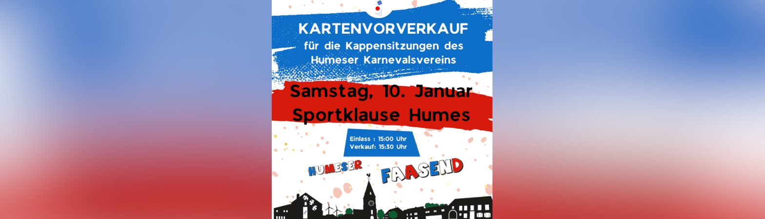Am 10.01.2026 findet der offizielle Kartenvorverkauf für unsere Kappensitzungen in der Sportklause Humes statt. Einlass und Nummernvergabe ist um 15:00 Uhr, Verkauf ab 15:30 Uhr. Weitere Infos folgen…
